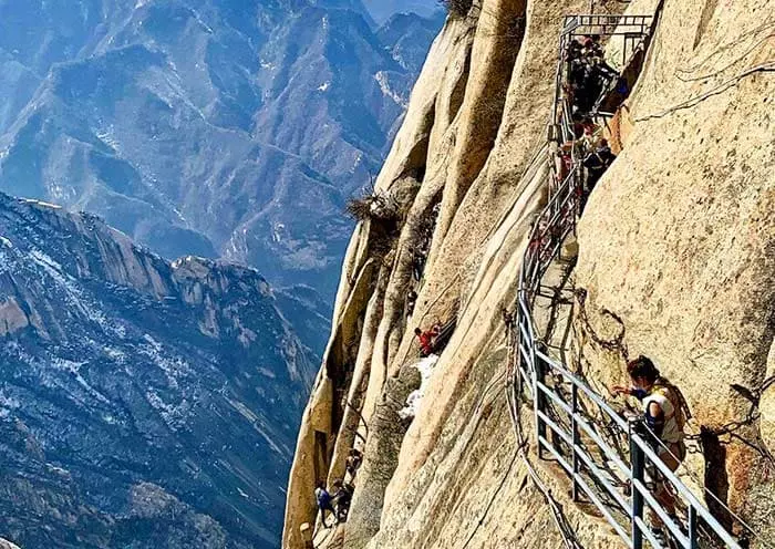 In this morning, your local guide and driver will pick you up from your hotel for a memorable trip to Mount Huashan, located 118km away and about 1.5-2 hours’ drive. Mount Huashan, also known as Huashan Mountain, one of the five sacred mountains of Taoism and is famous for its steep and narrow paths, as well as its stunning natural scenery. It is home to five peaks and has long been considered the most precipitous mountain in China, with its sheer granite rock face, rugged cliffs, and deep valleys.