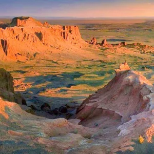Continuing our journey north, we head to the renowned Bayanzag, also known as the Flaming Cliffs. Famous for its stunning red sandstone landscapes, Bayanzag is one of the most significant dinosaur fossil sites in the world. Its vibrant red cliffs and hills, glowing under the rising or setting sun, earned it the name “Flaming Cliffs.” In the 1920s, American explorer Roy Chapman Andrews discovered a remarkable collection of dinosaur fossils here, including the world’s first fossilized dinosaur eggs and skeletons of species such as Protoceratops and Velociraptor.