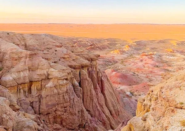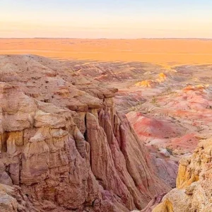 Highlight 7: Discover the dramatic, multi-layered cliffs of Tsagaan Suvarga, resembling an ancient city. An excursion through these colorful formations culminates in a breathtaking sunset, painting the unique landscape in fiery hues.
