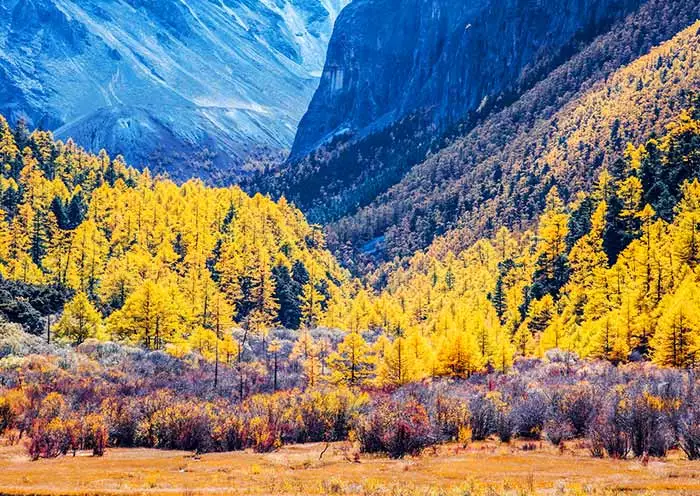 Highlight 1: Travel from Chengdu along the most scenic route to fully explore Western Sichuan. Capture stunning photos of Xinduqiao, with soft sunshine sparkling on the surrounding hills, golden and green poplar trees, little houses, and leisurely horses.