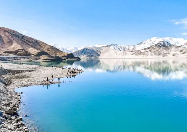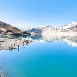 On the lake’s northern shore stands the renowned Baisha Mountain(白沙山), winding for over 1,200 meters. The dark mountain body, covered with white sand, presents a soft silvery-white color under the clean sunlight of the Pamir Plateau, resembling white silk. Legend has it that as the lake water gradually dries up in autumn and winter, the white sand at the bottom of the lake emerges. In spring, the wind blows this sand onto the mountain, creating the extraordinary spectacle of sand accumulating into a mountain. Whenever strong winds blow, Baisha Mountain emits a sound, earning it the name “Singing Sand Mountain.” The southern shore of the lake is embraced by a chain of snow-capped mountains, with the highest peak being Mount Kongur Tagh at an elevation of 7,530 meters, adding further grandeur and mystery to this captivating landscape.