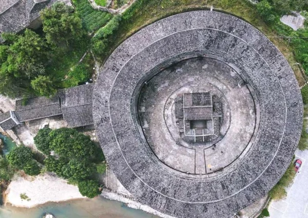 The Yuchang Building is a round Tulou which is not only a product of early joint-stock ownership but also a vivid demonstration of the special sentiment and application of Feng Shui and the number “five” in ancient Chinese architecture. Yuchang Building was jointly funded and constructed by five clans: Liu, Luo, Zhang, Tang, and Fan. The five clans divided the building into five sections based on their required rooms, with five sets of staircases and five observation decks on the outer walls. This design embodies the philosophical concept of the mutual generation of the five elements in Tulou architecture, promoting harmonious living, and also represents the aspiration for abundant harvests and good fortune. Perhaps because ancient Chinese people often used “five” for counting (with five fingers on each hand and foot) and considered it the largest and auspicious number. Yuchang Building has five floors: the first floor is the kitchen, the second floor is the granary, the third floor is for the elderly, the fourth floor is for the young, and the fifth floor is used for storing coffins. Interestingly, Yuchang Building has the most wells among Fujian Tulou buildings (22 wells). Each kitchen has its own well, allowing easy access to water by simply using a dipper. In the central courtyard of the building, there is a single-story circular ancestral hall. In front of the hall, there is a Yin-Yang Bagua pattern paved with cobblestones, divided into five sections representing the five elements: metal, wood, water, fire, and earth. The building consists of a total of 269 rooms. At its peak, it housed over 40 households with more than 360 people. Currently, there are 24 households with the surname Liu, totaling 123 residents. The Hakka people will invite you to their rooms, have a look at their well, and have a drink of Oolong tea made by the locals while learning more stories and folk culture in Tulou from the owner of the Hakka Castle.