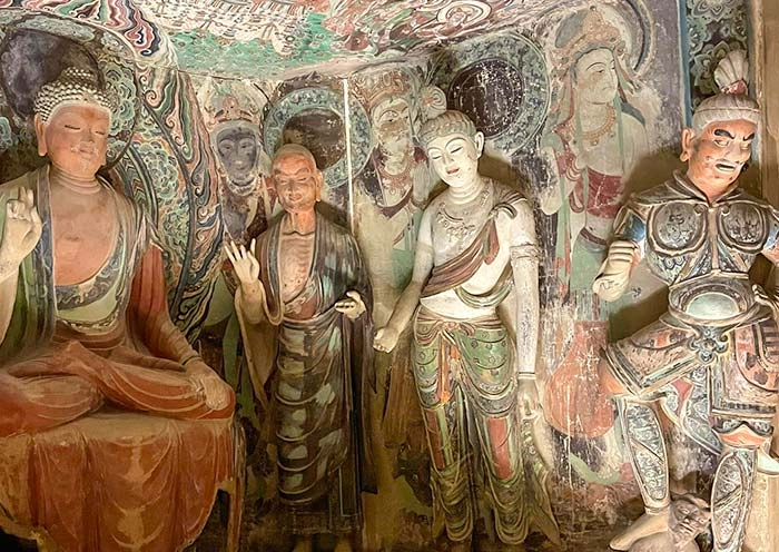 At the Mogao Caves, you can explore various types of grottoes (large statue caves, Nirvana caves, central pillar caves, vaulted ceiling caves, hall caves) and learn about the pigments used by ancient artists in painting murals (cinnabar, orpiment, azurite, mica, gamboge, gold leaf, shell powder). You can admire narrative paintings of Buddhist themes (the life of Shakyamuni Buddha, the Nine-Colored Deer Sacrificing Itself to Save Others), diverse clay sculptures (Buddha statues, Bodhisattva figures, guardians, deities), Flying Apsaras (飞天) and Swirling Dances (Sema; 胡旋舞) in the prosperous Tang Dynasty, as well as the attire and customs of patrons from various dynasties. At the Mogao Caves, you can witness the brilliance and charm of the ancient Silk Road and the efforts and achievements of generations of cultural heritage preservation workers and researchers (such as Chang Shuhong常书鸿, a Chinese painter known as the “guardian of Dunhuang”敦煌守护神).