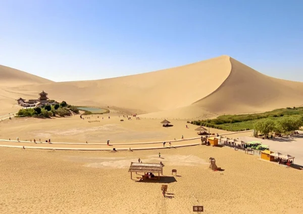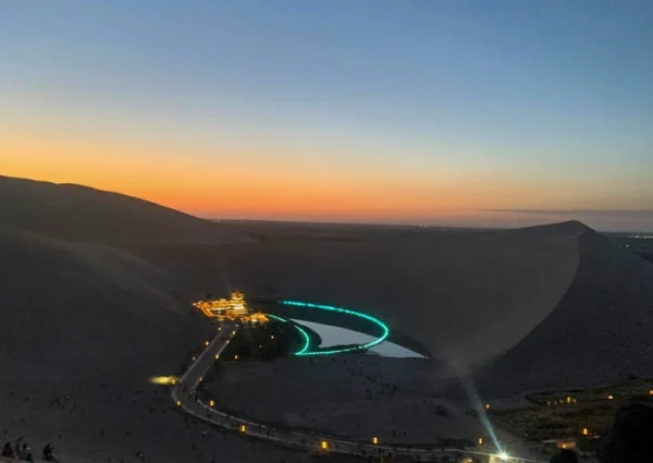 Highlight 6: Stand in awe in front of Mingsha Mountain & Crescent Lake, one of the Top 5 Most Beautiful Deserts in China, to witness the unique spectacle of mountains, spring, and sand coexisting in the desert. Sit atop the peak of Singing Sand Dunes and await a stunning sunset in front of the Crescent Spring.