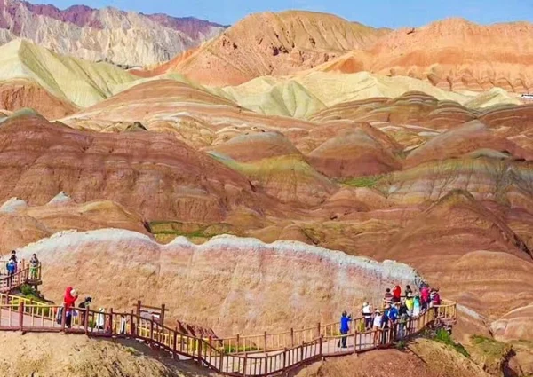 At the Zhangye Rainbow Mountains, you can admire unique features like the Rainbow Screen, Sleeping Beauty, Giant Scallop, Monks Worshiping Buddha, Monkey Gazing at the Sea, Turtle Asking the Heavens, and the Red Cliff Great Wall (七彩屏、睡美人,大扇贝、众僧拜佛、灵猴观海、神龟问天、赤壁长城). Standing at the mountaintop, one can witness the colorful watercolor-like mountain ranges, feeling as if stepping into a painting.