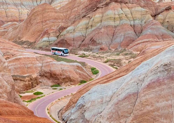 The scenic area comprises five Observation Decks (No. 3 and No. 2 have been merged). Shuttle buses connect each Observation Deck (entering and exiting at the north gate, with shuttle stops at four points in the order of Observation Deck #2-1-5-4). Observation Deck #1 and Observation Deck #4 are the most recommended. Yunhai Platform (云海台 No. 1) is where the image was taken on the ticket and the largest viewing platform, offering a panoramic view of the entire Danxia landscape, including the winding S-shaped road. Hongxia Platform (虹霞台 No. 4), highly popular and considered the most beautiful spot with the most vibrant colors, is the best place to watch the sunset. In the eyes of the Chinese people, the Rainbow Mountains here resemble delicious Pork Belly or Strawberry Cake layers.