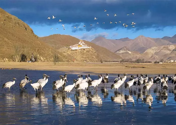 Start your day with an early transfer to Linzhou County (林周县), located about 65 km north of Lhasa (a scenic 1 to 1.5-hour drive). Sitting at an average altitude of 4,200 meters, Linzhou is a renowned winter bird-watching paradise, offering breathtaking landscapes of mountains, grasslands, wetlands, rivers, and lakes. This diverse ecosystem creates the perfect habitat for a wide variety of bird species, with the iconic black-necked cranes – an endangered species and a cherished symbol of Tibet – being the highlight. You’ll also have the chance to spot other fascinating species such as the bar-headed goose, ruddy shelduck, Himalayan griffon, and brown-headed gull.