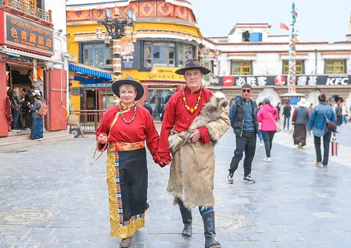 Afterward, take a walk on busy Barkhor Street near the Jokhang Monastery, which was a place for Buddhists to do a kora (pilgrim circuit) in ancient times. Nowadays, it has become a thriving local market where you can drink a pot of yak butter tea, dress in Tibetan clothes for photos, and pick up some local Tibetan, Nepalese, and Indian handicrafts and souvenirs.
