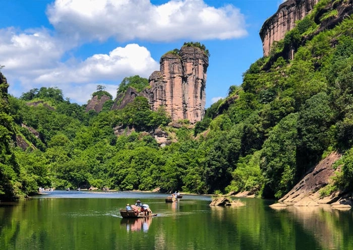 In the afternoon, head to the pier for a bamboo rafting ride down the Nine Bend Stream (九曲溪) to meander through the waters of Wuyishan and appreciate the picturesque beauty akin to a painting-like stroll. Jiuquxi, originating from the core nature reserve of Wuyishan National Park, is the most beautiful stream in China. It stretches for 9.5 kilometers and is renowned for its nine bends and eighteen bays, allowing visitors to experience the essence of natural heritage in this area. As the raft glides through the water, you can admire towering sandstone cliffs, lush green forests, and cascading waterfalls. You may also have the opportunity to spot local wildlife, such as monkeys, squirrels, and birds. The flowing water gracefully curves nine times, revealing unique and picturesque landscapes at each turn. Embarking on a journey from the beginning of the “Nine Curves” and following the stream to the “One Curve”, you will be treated to breathtaking views of the azure sky, fluffy white clouds, crystal-clear water, majestic red mountains, and lush green trees. Along the way, immerse yourself in the ancient love legends of Dawang Peak (大王峰) and Yunv Peak (玉女峰), and explore, appreciate, and capture real-life settings that depict famous scenes from the classic novel “Journey to the West”. Additionally, from a distance, you can witness the marvelously preserved remnants of hanging coffins on the steep cliffs of both riverbanks. Allow yourself to be captivated by the beauty of the mountain scenery, delight in the vibrant hues of the water, and experience the enchanting allure of this heavenly landscape. The entire experience will last approximately 1.5 hours.
