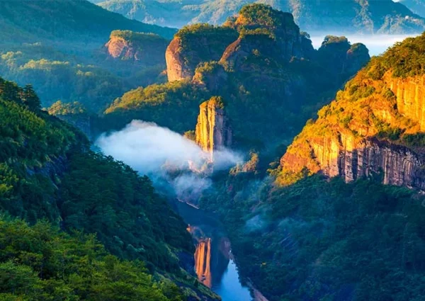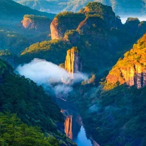 On this day, you will spend a full day exploring the essence of Mount Wuyi. First, take a sightseeing bus to the foot of Tianyou Peak, also known as Heavenly Tour Peak (天游峰), one of Wuyishan’s most renowned and beloved attractions. To reach the summit of Tianyou Peak, you will need to hike up a steep staircase consisting of over 800 steps. However, the effort is well worth it, as the summit offers awe-inspiring panoramic views. As the saying goes, “Not ascending to the summit is as good as not visiting”. Once you reach the peak, lean against the railing and behold the breathtaking scenery that unfolds before your eyes. The vast expanse of clouds, the majestic suspended peaks, the meandering bends, and the gentle swaying of bamboo rafts create a captivating visual spectacle. The landscapes of Wuyishan Mountain, with its mountains and waters, are fully displayed, providing a feast for the senses. As you gaze upon the ever-changing and unpredictable sea of clouds, you will be immersed in a world of wonder and beauty.