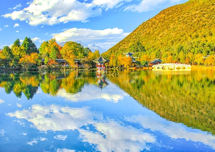 Afterward, let’s head to Black Dragon Pond Park (黑龙潭公园), located at the northern edge of Lijiang Old Town. This picturesque location offers stunning views of the surrounding landscape, highlighted by the majestic Jade Dragon Snow Mountain. On clear days, the reflection of the snow-capped peak on the tranquil water of the Black Dragon Pool creates a breathtaking scene.