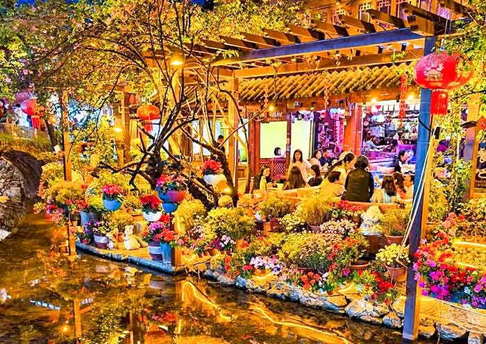 Lijiang Old Town takes on a different ambiance in the evening, showcasing its unique charm. (1) Here are some recommended alleys for taking awesome photos: Xianwen Alley (现文巷, also known as Oil-paper Umbrella Street), Zhenxing Alley (振兴巷, Lantern Street), Nanmen Bridge (南门桥,Wind Chime Street), and Sakura Restaurant (樱花餐厅), among others. (2) For those seeking nightlife, bars, and local cuisine, the following alleys are recommended: Sifang Street (where you can witness a bonfire dance performed by the Naxi people around 19:00), Wuyi Street (五一街), Xinhua Street (新华街), Zhongyi Market (忠义市场), etc.