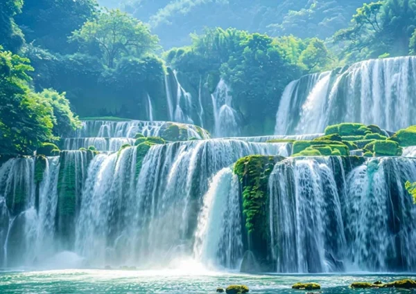 As you continue, discover surreal scenes, such as the mighty Laya Waterfall (拉雅瀑布), where water drops over 30 meters from a mossy cliffside, forming a powerful, curtain-like cascade. The multi-layered 68-Level Waterfall (68级叠水瀑布) follows each layer displaying its own character, rhythmic and graceful, like nature’s flowing poetry.