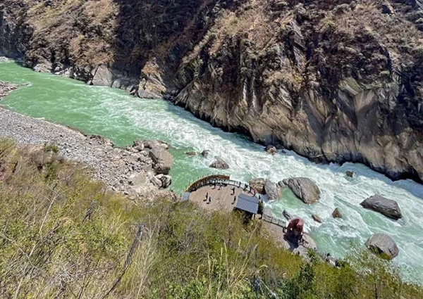 Later, continue your drive to the Upper Section of Tiger Leaping Gorge (上虎跳, altitude: 1,800 meters). According to legend, the section got its name when a tiger, chased by a hunter, took a legendary leap across the narrowest point, cornered by the rushing Jinsha River (part of the Yangtze River) at the gorge’s base. One of the deepest gorges in the world, Tiger Leaping Gorge offers a breathtaking view of the roaring Jinsha River, allowing you to feel the strong power of nature. As Jade Dragon Snow Mountain (5,596m) and Haba Snow Mountain (5,386m) stand on each side, you will immerse yourself in the beautiful and diverse landscapes. You will walk along the plankroad, both up and down. (Optional: If you want to save energy, you can use the lift, with an extra fee.)