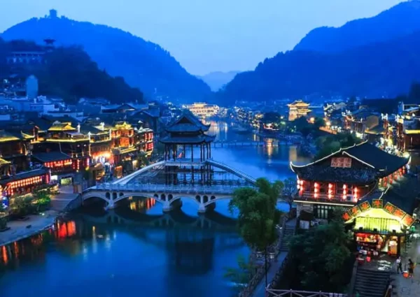 The night view of Fenghuang Ancient Town is truly enchanting. As you stroll through the old courtyards and well-preserved wooden houses along the riverside, you will witness the vibrant atmosphere of the night market and bars. The dazzling lights create a magical ambiance, making it a truly wonderful experience.
