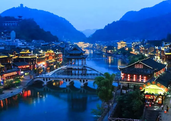 As one of the most beautiful towns in China, Fenghuang Ancient Town is home to various ethnic groups, primarily the Miao and Tujia peoples. It is renowned for its picturesque setting along the tranquil Tuo River, where traditional stilt houses (Diaojiaolou;吊脚楼) are tightly packed. Along the riverbanks, women can be seen washing clothes and cleaning rice and vegetables, while men fish using their nets. The preparation of food on the riverbank remains much the same as it has been for centuries. Taking a short 10-minute boat ride along the Tuo Jiang River is a delightful way to relax and immerse oneself in the surroundings.