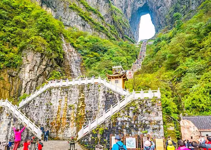 Highlight 6: Worship the Tianmen Cave which is a giant hole on the mountain created by nature, and views the sharp zigzag roads at Tianmen Mountain.