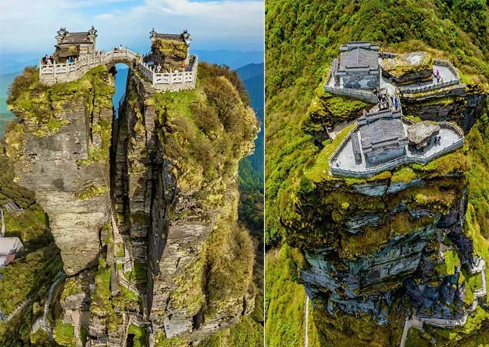 At an altitude of 2336 meters, two Buddhist temples (Sakyamuni Hall and Maitreya Hall) are built on the peaks on either side of the Red Clouds Golden Summit, connected by a stone bridge, symbolizing the transition from “reality” to the “future.”