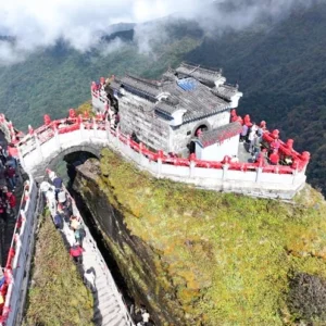 While climbing, you’ll need to hold onto iron chains and carefully ascend narrow 85-degree steps. The initial section is very narrow, opening up to a stone path wide enough for one person before suddenly emerging from the clouds – congratulations, you’ve reached the summit! After reaching top, first pay homage to Sakyamuni Buddha to pray for present life, then cross stone bridge to Maitreya Buddha to pray for future. Standing by stone fence, look down at clouds zooming by mountainside, and soak up sun feeling good on your tired body.