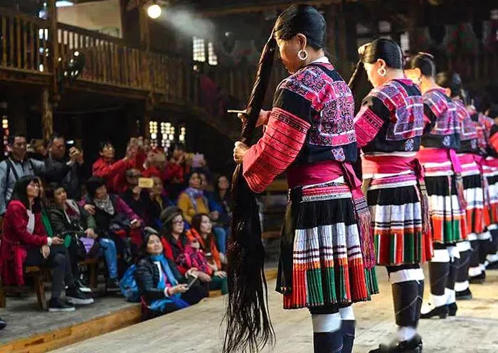 In the morning, you will arrive at the Huangluo Yao Village (population of over 400) which is famous as “the World’s Longest Hair Village”. You will marvel at the dramatically long and pitch-black hairs worn by its women of the Yao ethnic group. The village has over 70 Yao women with hairs over 1 meter (the longest hair of 2.72 meters) which has been listed by Guinness World Record as the “longest hair group”. By watching the performances of villagers (45min, optional), such as folk songs, drum dances, Red Yao wedding customs, sunning red clothes, and combing long hair, you will learn about the history, traditions and way of life of the Red Yao people, such as customs like spinning and weaving. You can even ask Red Yao women to share their secrets on how to take care of their long hair and how to make their Rice Water Shampoo.
