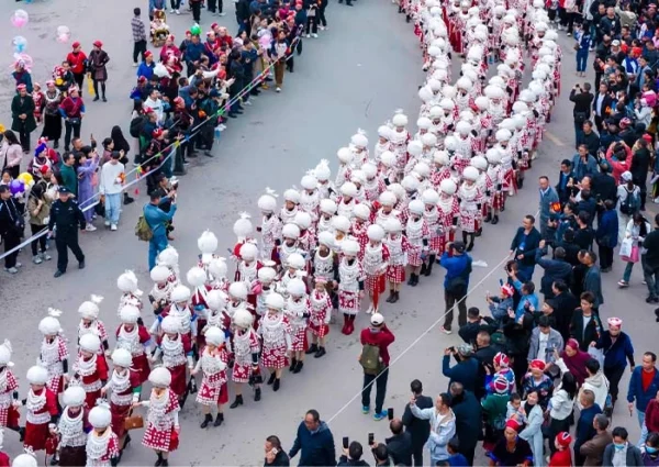 Upon arrival, you will be greeted with the “Twelve Cups of Block-Way Rice Wine” ceremony. Villagers dressed in magnificent silver headdresses and embroidered clothing will welcome guests and offer rice wine in ox horn cups. This is the highest etiquette of the Miao people for receiving distinguished guests, with each cup of wine representing blessings for a month. Afterward, you will walk along the stone-paved path to the Lusheng ground in the center of the village. Here, a wonderful Miao song and dance performance will take place, featuring toasting songs, Miao flying songs, and Lusheng dances in succession, leaving you mesmerized.