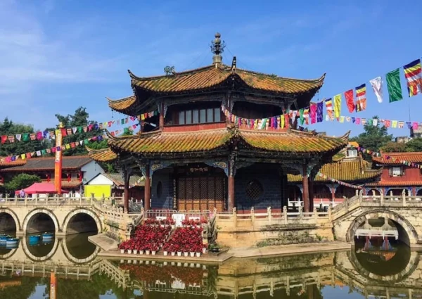 After that, you will head back to Kunming for Yuantong Temple. Located in the city center, Yuantong Temple combines tranquility amidst the bustling surroundings, offering a unique water courtyard temple. The temple has a history of over 1,200 years and is the oldest Guanyin Temple in China. Particularly noteworthy is its “Downhill Temple” design, where instead of ascending steps after entering the mountain gate, one descends gradually, creating a rare architectural feature among temples in China. Yuantong Temple is the only sacred place in the country that simultaneously accommodates the Han, Southern, and Tibetan Buddhist traditions. At the rear of the temple, there is a typical Southeast Asian Buddhist architectural structure called the Bronze Buddha Hall (铜佛殿), which was built in 1985 specifically to house a bronze statue of Shakyamuni Buddha presented by the Buddhist Association of the Kingdom of Thailand. It has gained a high reputation in the Southeast Asian area and attracts many pilgrims and locals to visit every year.