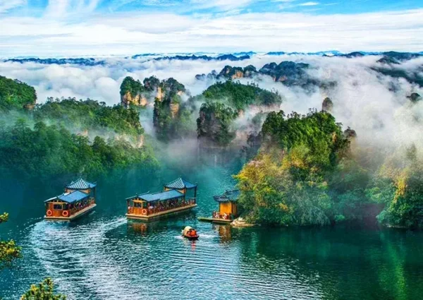 Next, take the sightseeing bus to the second tourist site – Tianzi Mountain Nature Reserve which was named after the leader of the local Tujia ethnic group – Xiang Dakun in early Ming Dynasty (1368-1644). It is a fairyland in moive Monkey King. Hike to He Long Park which has a fascinating viewing deck to appreciate the incredible and magnificent scene of peculiar stone peaks. Move to Dianjiang Terrace to overlook the West Sea Stone Forest, rugged rock rising out of a misty canyon. The last stop today is the Ten-mile Galley. You will take a small green train to explore the beautiful scenery where you will feel like get through a Chinese ink painting. After the tour, get back to your hotel for a good rest.