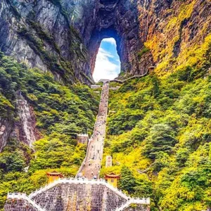 Today, you will spend a half-day tour of Tianmen Mountain in Tianmenshan National Forest Park, known as as the “Soul of Zhangjiajie” and the “No.1 Sacred Mountain of Western Hunan Province”. Located only 8 kilometers away from Zhangjiajie city center, the Tianmen Mountain Scenic Area is unique in that it is suitable for people of all ages, and climbing is not necessary. There is the world’s longest cable car, spanning 7,455 meters, which takes you directly to the mountaintop. Additionally, there is a small cableway available on the mountaintop. The only section that requires walking is the Tianmen Cave staircase, but don’t worry, there is also an elevator available.