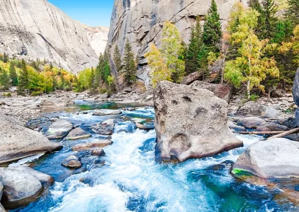 You can also enjoy views of Shenzhong Mountain, also known as Amir Sala Peak, a unique granite spire resembling a bell. Rising sharply from the flatlands on the south bank of the river, it stands at an elevation of 1,608 meters, with a relative height difference of 365 meters, making it one of the most scenic peaks in the Altai Mountains. Birch trees, green pines, and Siberian spruces thrive in the crevices of the rock walls. The mountain’s surface features smooth yet steep slopes due to concentric circular layering, shaped by frost weathering and erosion along these planes.