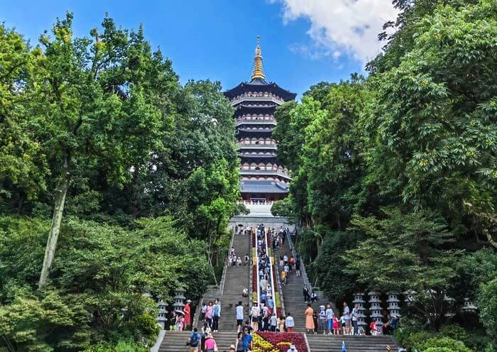If you are interested in “The Butterfly Lovers” (梁祝/Liang Shanbo and Zhu Yingtai/Liang Zhu), an intangible cultural heritage of China with a history of 1,700 years, you can visit the Wan Song Ancient Academy (万松书院, 940m from the Long Bridge), where Liang Shanbo and Zhu Yingtai once studied together for three years. Today, it is a famous spot for blind dates in Hangzhou. You can also visit the Long Bridge (长桥, 900m away from Leifeng Pagoda), where they bid farewell with deep affection. Nowadays, it is a popular location for couples to take photos of Leifeng Pagoda in the Sunset (雷峰夕照). Speaking of Leifeng Pagoda, you can’t miss the touching legend of “The White Snake” (白蛇传) – “After cultivating for 1700 years, the White Snake transformed into the beautiful Bai Niangzi (白娘子). She descended to the mortal realm to search for her past-life benefactor, Xu Xian (许仙). They met on the Broken Bridge (断桥), parted ways at the Leifeng Pagoda, and thus unfolded the most extraordinary love story in Chinese mythological history. There are two autonomous escalators that transport visitors to the base of Leifeng Pagoda (self-pay). The pagoda itself offers bird’s-eye views of West Lake, the entire city of Hangzhou, and Jingci Temple (净慈寺), which is famous for being one of the “Ten Scenes of the West Lake” (西湖十景) – “Evening Bell Ringing at the Nanping Hill”(南屏晚钟).